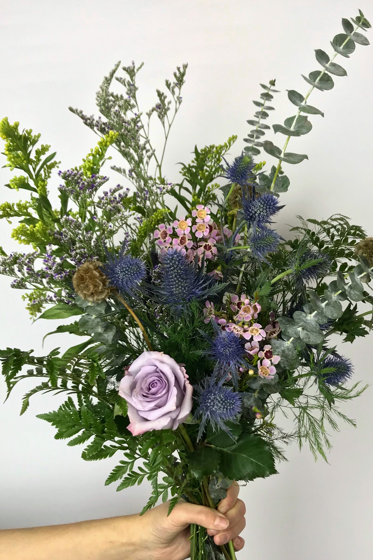 Bouquet aux allures sauvages composé de roses mauves, wax flowers, éryngium, scabiosa et autres feuillages.