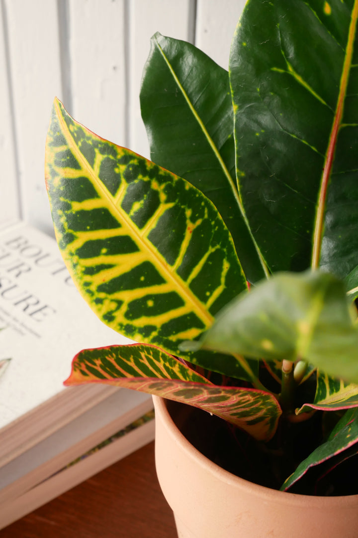 "Codiaeum variegatum" or Croton is a beautiful decorative plant with colorful leaves. It will bring a touch of originality to your collection of indoor plants.