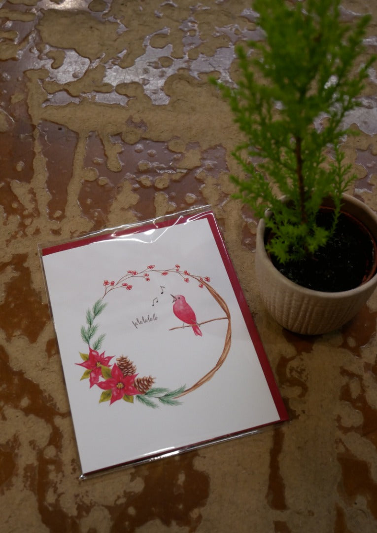 Carte de Noël - Couronne et oiseau qui chante