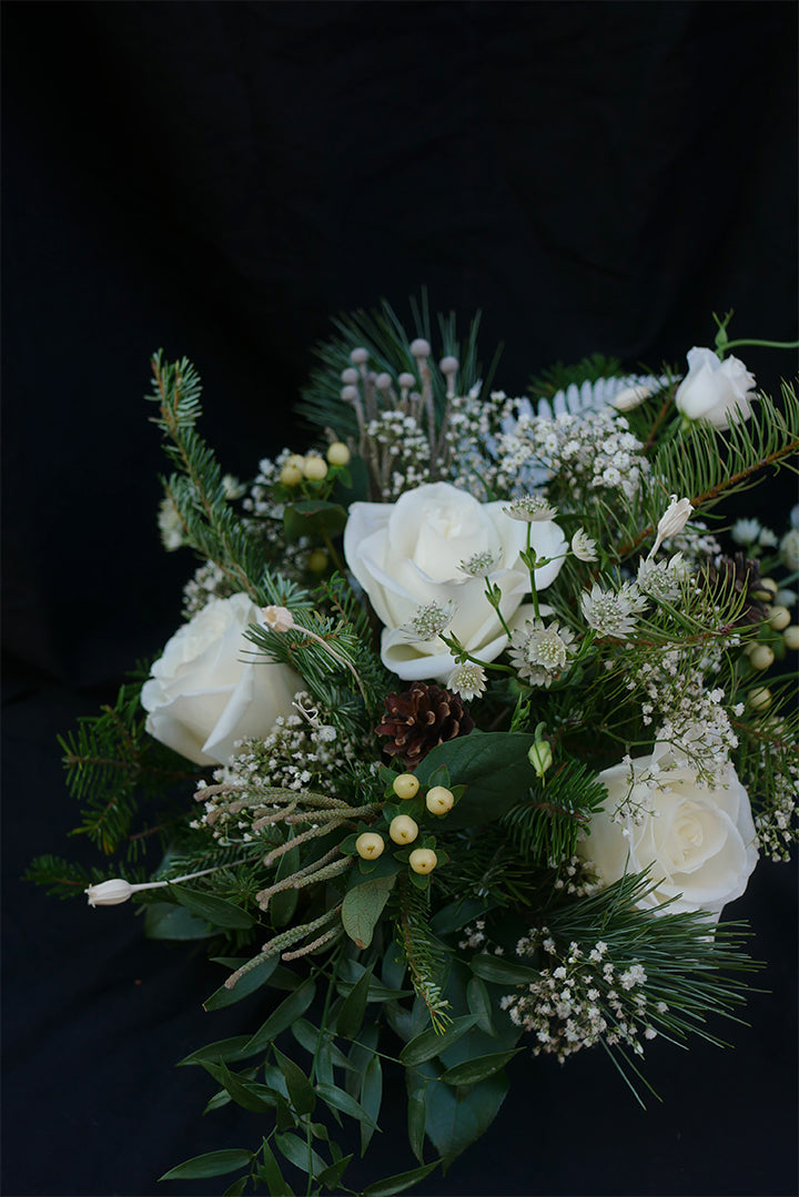 Un centre de table moderne, composé de sapinage, de fleurs blanches et de cocottes.