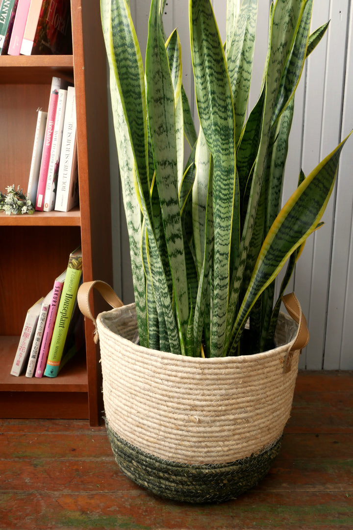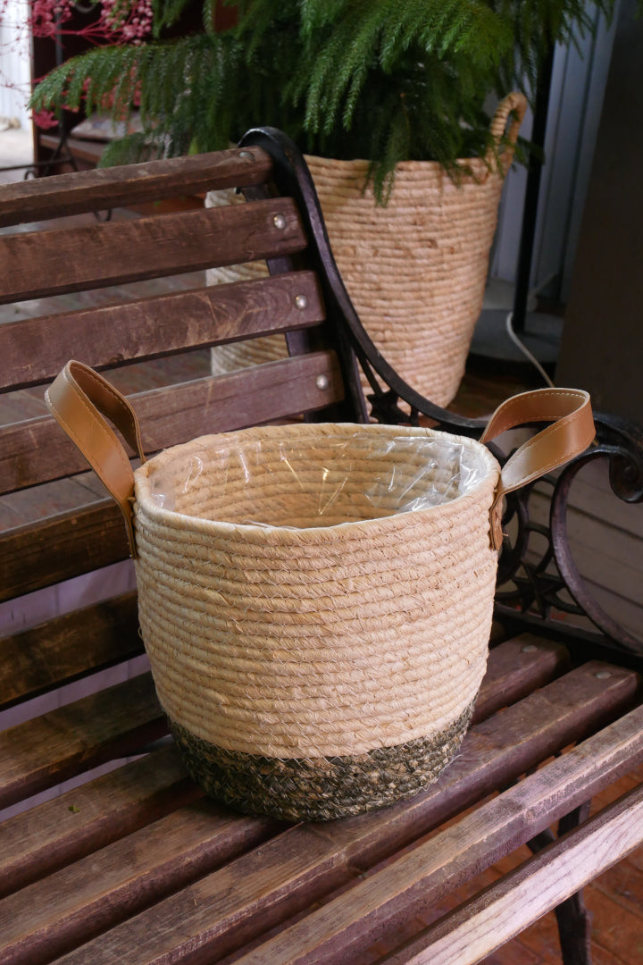 Panier en jonc de mer naturel et vert, pour utiliser comme cache-pot pour une plante ou comme panier pour du rangement. Anses en cuir.